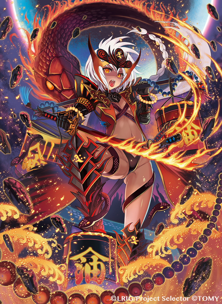 1girlbikiniblack bikiniblack glovesbootscopyright noticedark skindark-skinned femaledouzan (wixoss)fireflaming swordflaming weaponfull moonglovesgrey hairholdingholding lanternholding swordholding weaponjacketlanternlooking at viewermedium hairmoonnavelred bootsred jacketsnakesolospiked hairswimsuitswordweaponyellow eyes