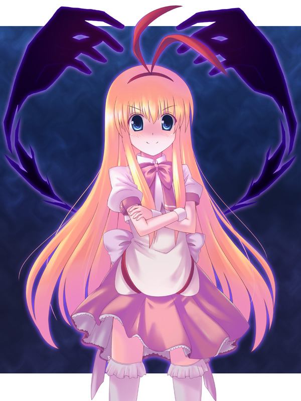 00sblonde hairblue eyeschildcrossed armshairbandlong hairskirtsolothighhighswristbandzettai ryouiki