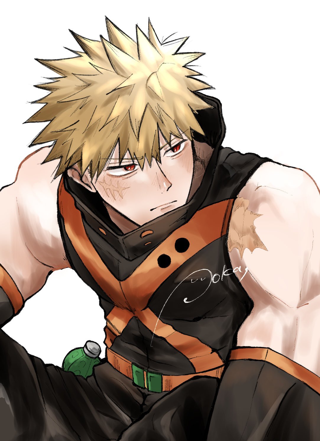 1boybeltblonde hairbroad shouldersclosed mouthdetached sleevesexplosivefacial scarfrowngrenademale focusorange beltpantspokapoka elred eyesscarscar on cheekscar on facescar on shouldershirtshort hairsignaturesimple backgroundsittingsleevelesssleeveless shirtsolospiked hairwhite background