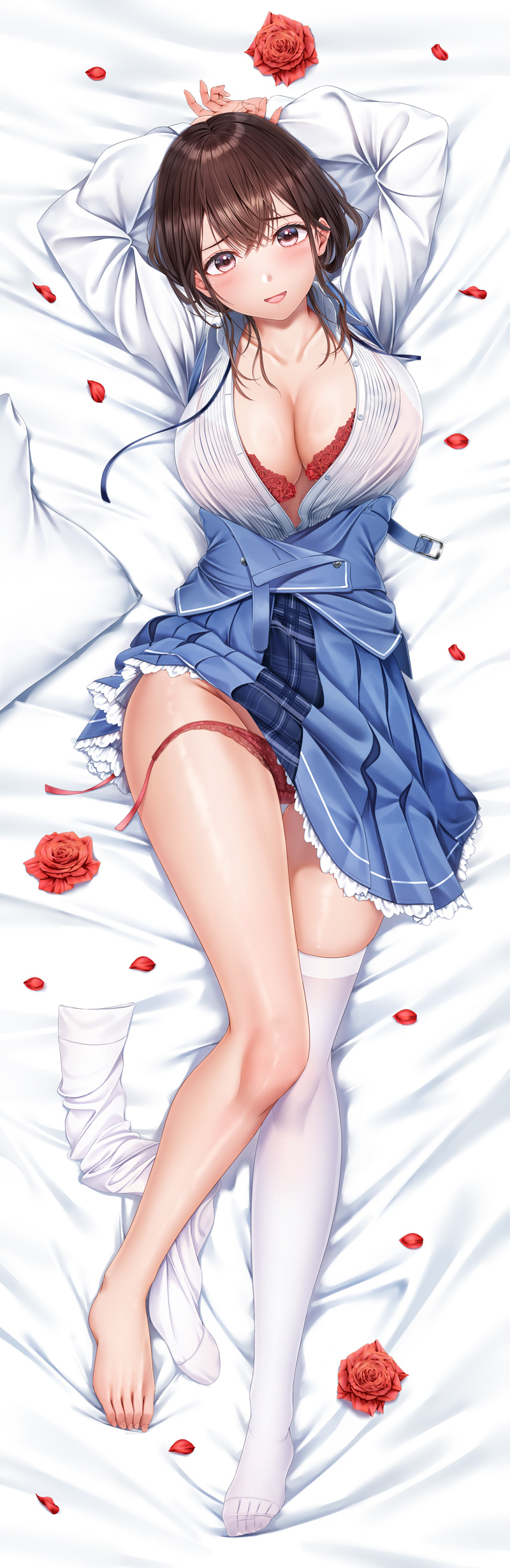 1girlarms upbrabreastsbrown eyesbrown haircleavageclothes liftdakimakura (medium)flowerfull bodylarge breastslooking at viewerlyingno shoeson backopen braopen mouthpantiesred brared flowerred pantiesred petalsred roseroseshirtside-tie pantiessingle bare footsingle thighhighskirtskirt liftsolothighhighsunderwearuntied pantiesunworn thighhighswhite shirtwhite thighhighsyahiro mio