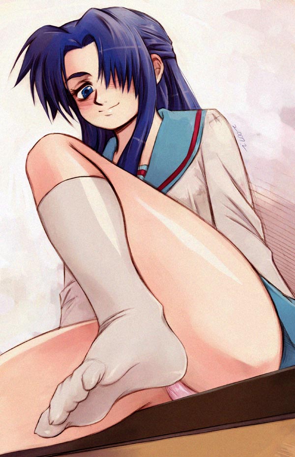 00sblue eyesblue hairfeetfrom belowgym uniformhair over one eyelong hairpantiespantyshotpovribbonschool uniformserafukusmilesockssolothighstoesunderwear