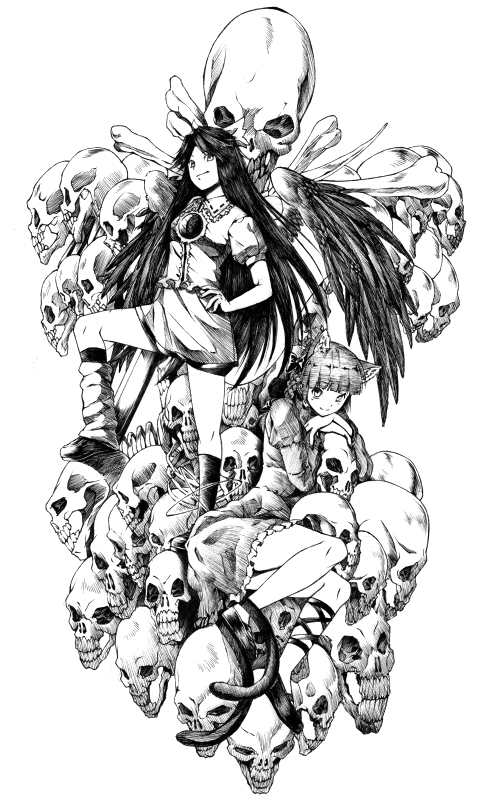2girlsanimal earsbraidcat earscat girlcat taildressfemale focusgreyscalemonochromemultiple girlsribbonskirtskullsockstailtwin braidstwintailswhite backgroundwings