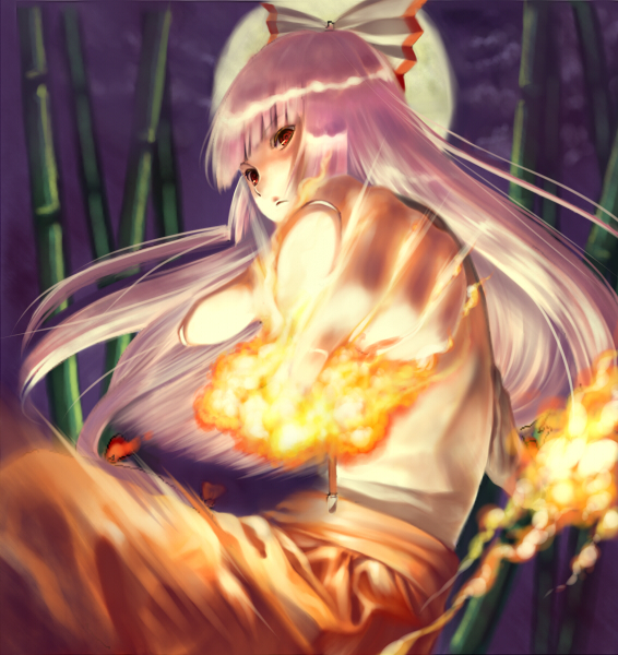 1girlaurabamboobamboo forestbowfemale focusfireforeshorteningforesthair bowlong hairmoonnaturered eyessolovery long hairwhite hair