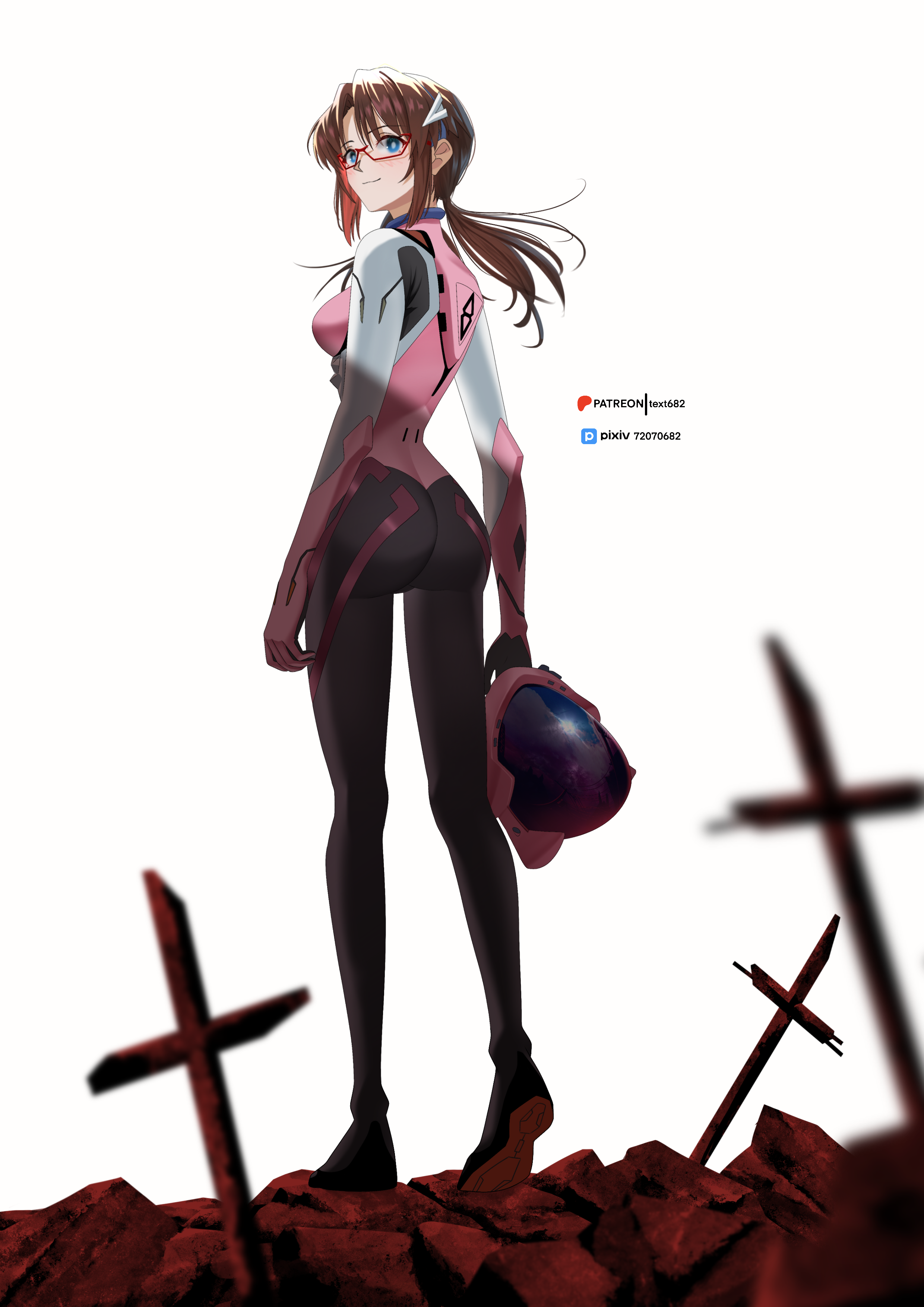 1girlassblue eyesblurryblurry foregroundblushbodysuitbreastsbright pupilsbrown hairclosed mouthcrossfloating hairfrom behindfull bodyglasseshair ornamenthairclipheel uphelmetholdingholding unworn helmetlooking at viewerlooking backlow ponytailmecha pilot suitmedium breastspatreon logopilot helmetpink bodysuitpixiv idpixiv logoplugsuit (evangelion)ponytailred-framed eyewearsemi-rimless eyewearshadesimple backgroundskin tightsmilesolostandingunder-rim eyewearunworn headwearunworn helmetwhite backgroundwhite pupils