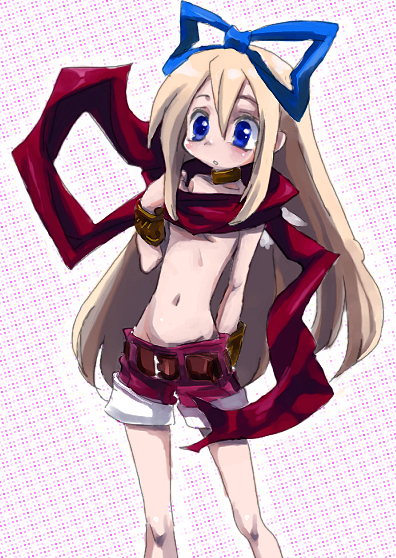 1girlblonde hairblue eyesbowchokercosplayfemale focusflat chesthair bowlaharl (cosplay)long hairmidriffnavelred scarfred shortsscarfshortssolowings