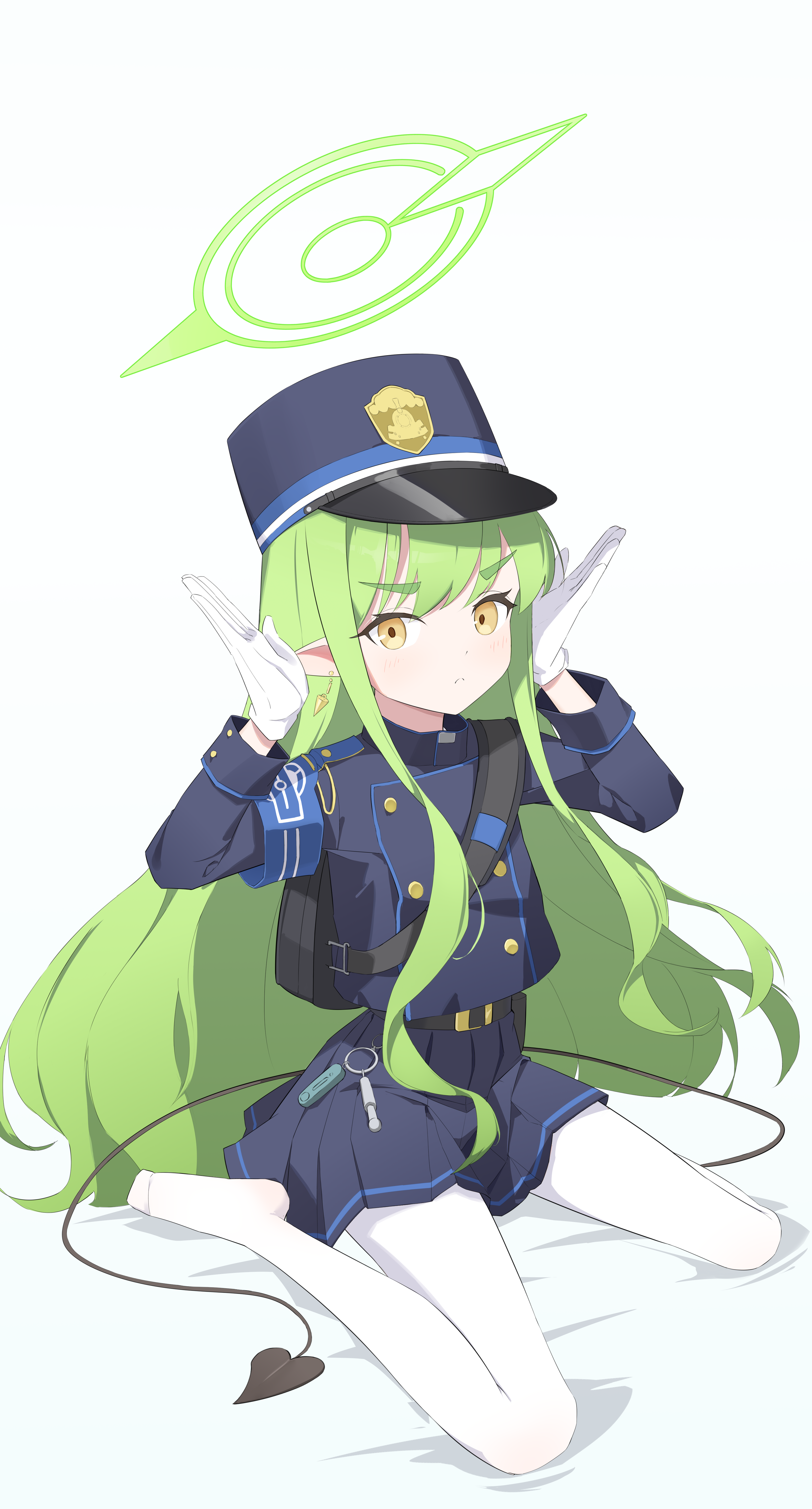 1boy1girlarmbandbeltblack beltblack hatblack jacketblack skirtblue armbandblushbuttonsclosed mouthdemon girldemon taildouble-breastedearringsfrownfull bodyglovesgreen hairgreen halohair between eyeshalohands uphatjacketjewelrylong hairlong sleeveslooking at viewermaking facesminiskirtno shoespantyhosepeaked cappleated skirtpointy earsromaji commentarysidelockssimple backgroundsittingskirtsolosplit mouthtailthick eyebrowsv-shaped eyebrowsvery long hairwarizawhite backgroundwhite gloveswhite pantyhoseyellow eyes