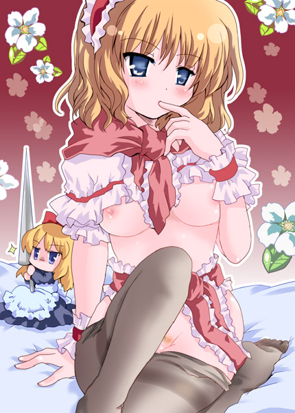 1girlbed sheetblonde hairblue eyesblushbreastsclothes pullfemale focusfemale pubic hairfinger to mouthflapper shirtflowerhairbandlancenaughty facenipplesno brano pantiespantyhosepantyhose pullpolearmpubic hairseriousshirtshort hairsittingsolospearunderboobweapon