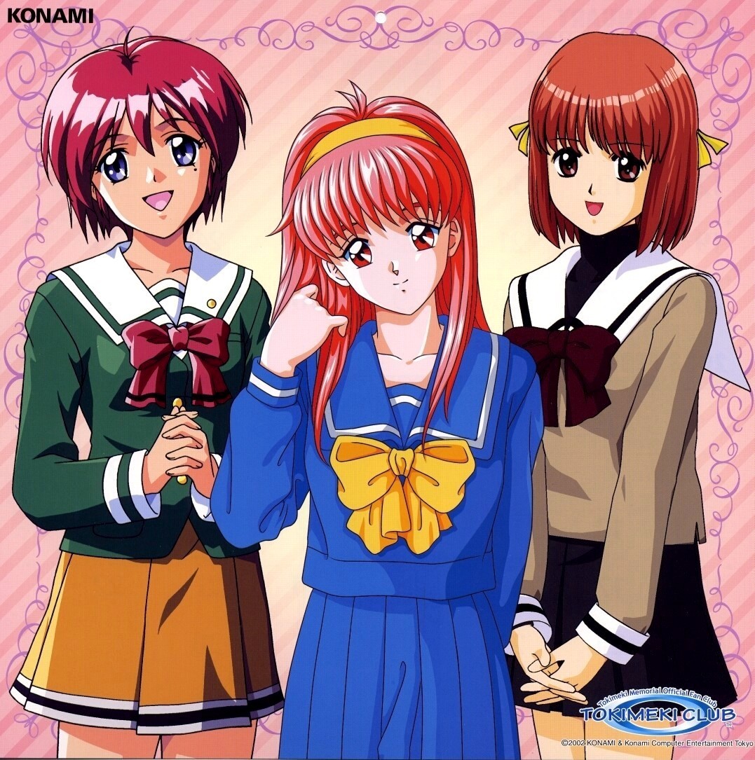 00s1990s (style)20023girlsadjusting hairblue eyesblue sailor collarbowgreen shirthairbandin-franchise crossoverlong hairmolemole under eyemultiple girlsorange skirtown hands claspedown hands togetherpink hairred eyesred hairretro artstylesailor collarschool uniformserafukushirtshort hairskirtyellow bow