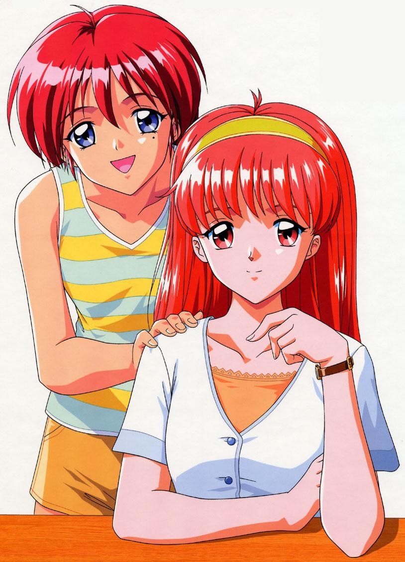 :d1990s (style)2girlsbare armsblue eyescollarbonehairbandhand on another's shoulderin-franchise crossoverlooking at viewermolemole under eyemulticolored shirtmultiple girlsopen mouthred eyesred hairretro artstyleshort sleevessmiletank topwatchwristwatch