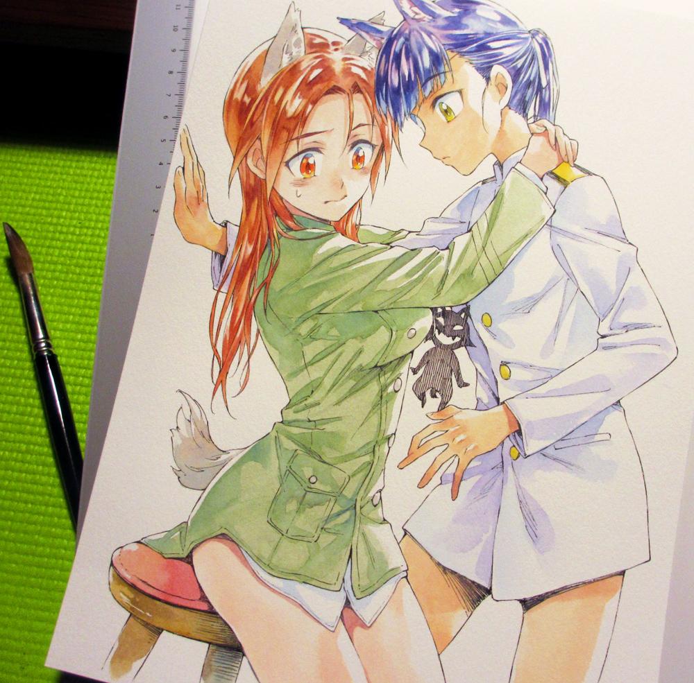 agnes tachyon (umamusume), jungle pocket (umamusume), umamusume, highres, 2girls, ahoge, animal ears, black background, bow, braid, buttoned cuffs, buttons, crop top, english text, flat color, floppy sleeves, hair between eyes, hair ornament, hairpin, holding hands, horse ears, horse girl, horse tail, lab coat, loose hair strand, medium hair, messy hair, miy2q, monochrome, multiple girls, shirt, short hair, simple background, single braid, smile, sweatdrop, tail, twitter username, yuri