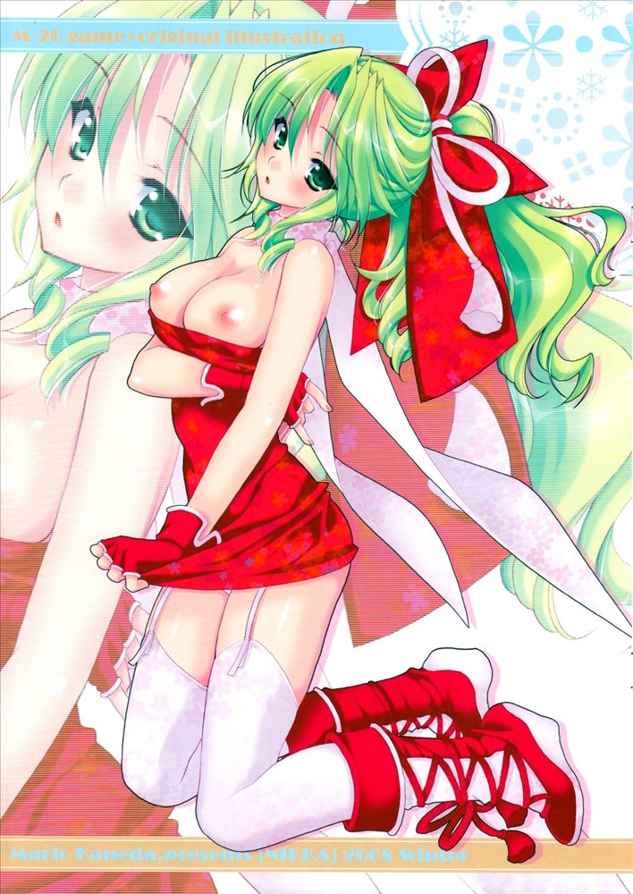 1990s (style)1girlbootsbreastscapeclothes liftdressfemale focusgarter beltgreen eyesgreen hairkneelinglong hairmatching hair/eyesminiskirtnipplespantiesponytailred ribbonretro artstyleribbonskirtskirt liftsolothighhighsunderwearzoom layer