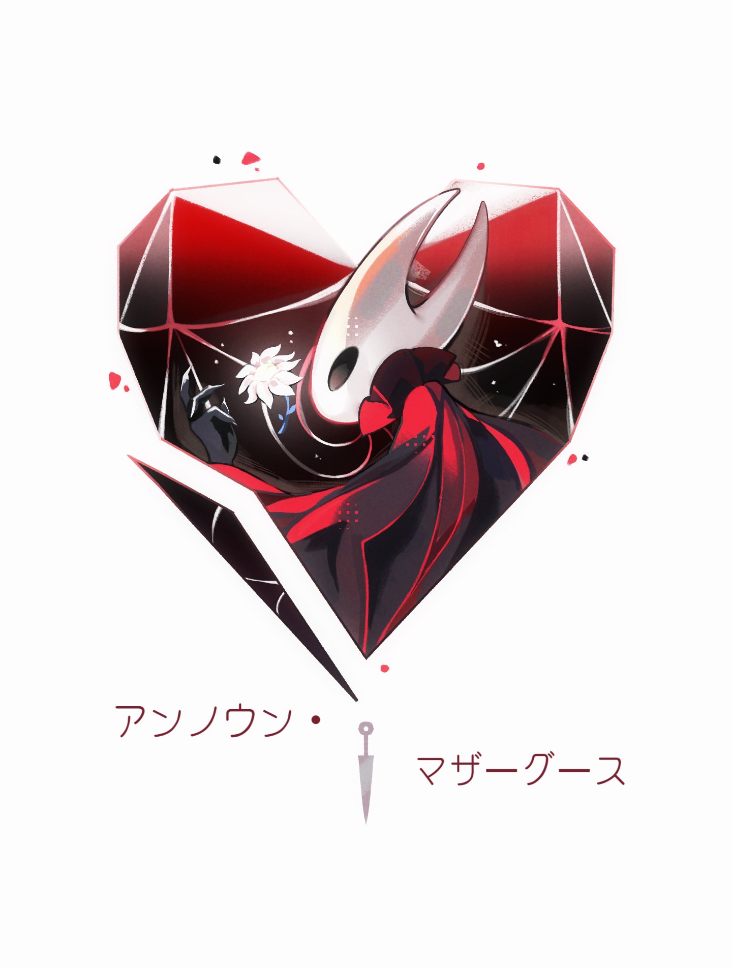1girlarthropod girlblack eyesblack skincloakcolored skineverbloom (hollow knight)flowerglowingheart-shaped gemhollow eyeshorned maskhornslooking at objectmaskneedle (hollow knight)red cloakruizi 06solowhite flowerwhite mask