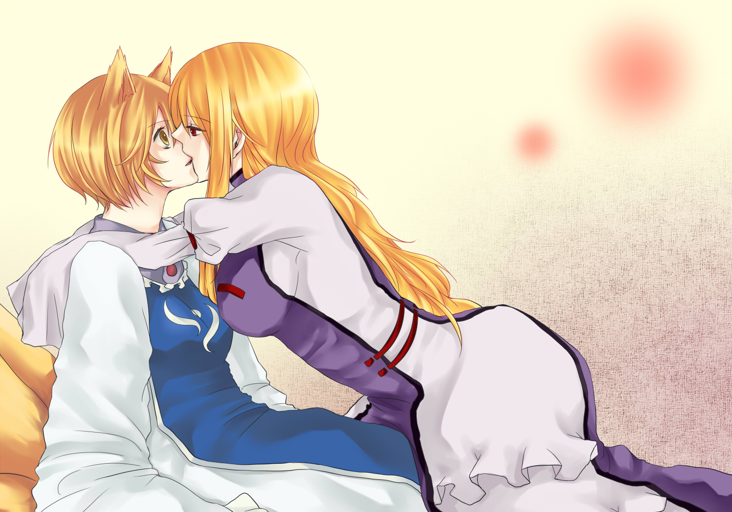 2girlsanimal earsblonde hairbreastsdressfemale focuskisslarge breastslong hairmultiple girlsred eyesshort hairtailyellow eyesyuri