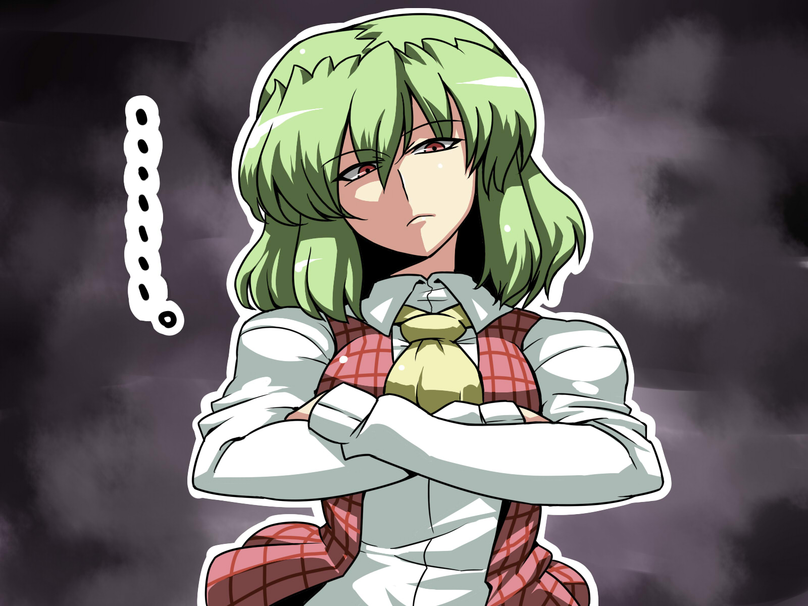 1boy1girlascotcompletely unamusedcrossed armsfemale focusfrowngreen hairplaid clothesplaid skirtplaid vestred eyesshaded faceshort hairskirtskirt setsolounamusedupper bodyvest