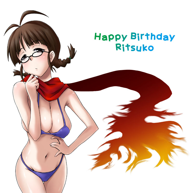 00s1girlbikinibraidbreastsbrown eyesbrown hairfemale focusglassesscarfsoloswimsuittwin braidswhite background