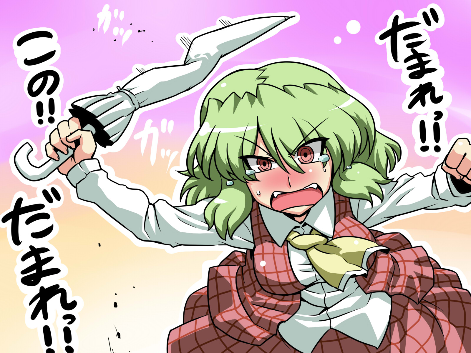 ruit, kazami yuuka, touhou, 1girl, arm up, ascot, cloud, day, female focus, flower, green hair, plaid clothes, plaid skirt, plaid vest, red eyes, short hair, skirt, skirt set, smile, solo, sunflower, vest