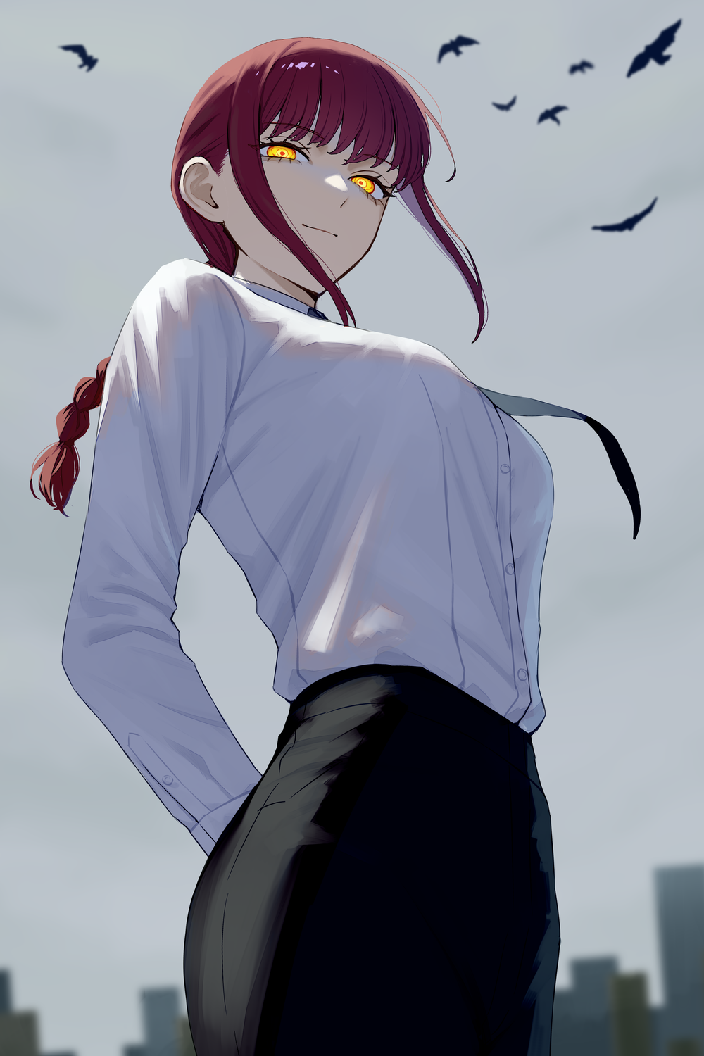 1girlarms behind backbirdblack necktieblack pantsbraidbraided ponytailbreastsclosed mouthcrowdaiasouken (dri)large breastslong sleevesnecktieoutdoorsovercastpantsred hairshirtshirt tucked insidelocksskysolowhite shirtyellow eyes