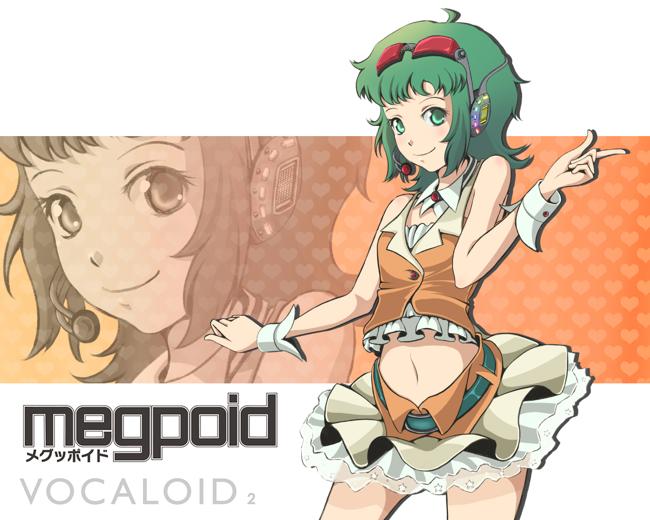 1girlbeltfemale focusgogglesgreen eyesgreen hairheadphonesheadsetmatching hair/eyesmidriffone eye closedskirtsmilesolowing collarwinkwrist cuffs