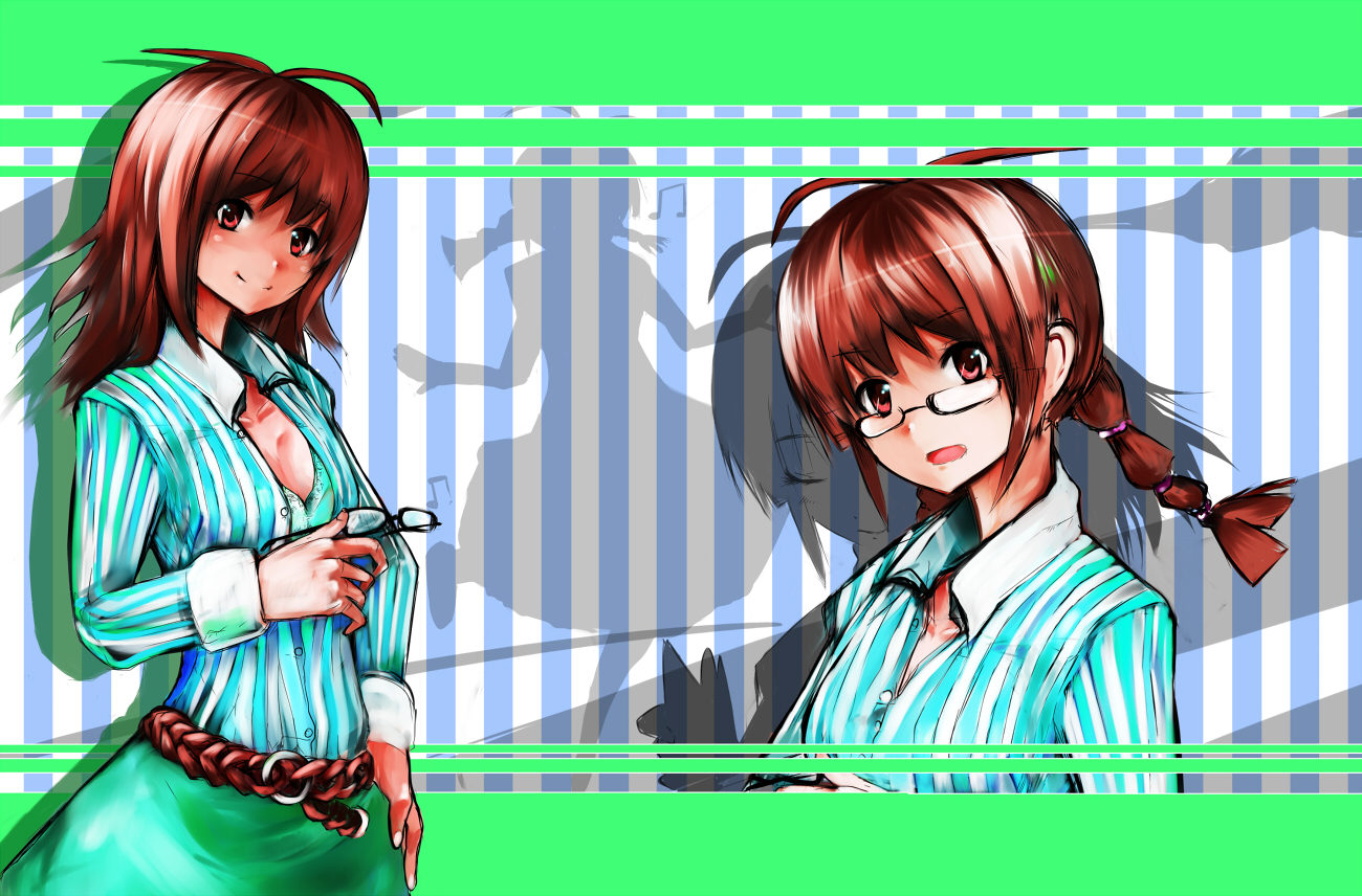 00santenna hairbraidbreastsbrown eyesbrown haircleavageglasseshair downholdingholding removed eyewearsmiletwin braidsunworn eyewear