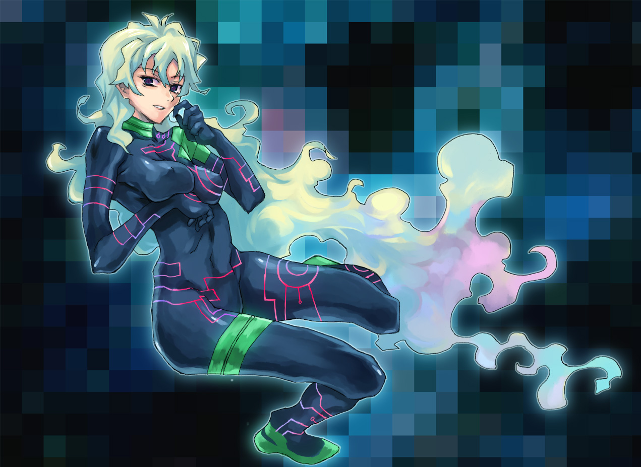 00s1boy1girlblue eyesbodysuitbreastscollarbonecovered erect nipplesdark personafemale focusgroinlarge breastslong hairmulticolored hairnavelsilhouetteskin tightsmilesolosymbol-shaped pupilsteethvery long hairwhite hair