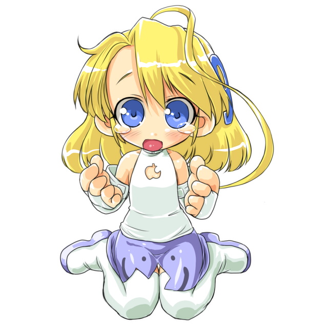 1girlaged downblonde hairblue eyesblushfemale focuskneelinglong hairmacintoshsolotearsthighhighswhite thighhighs