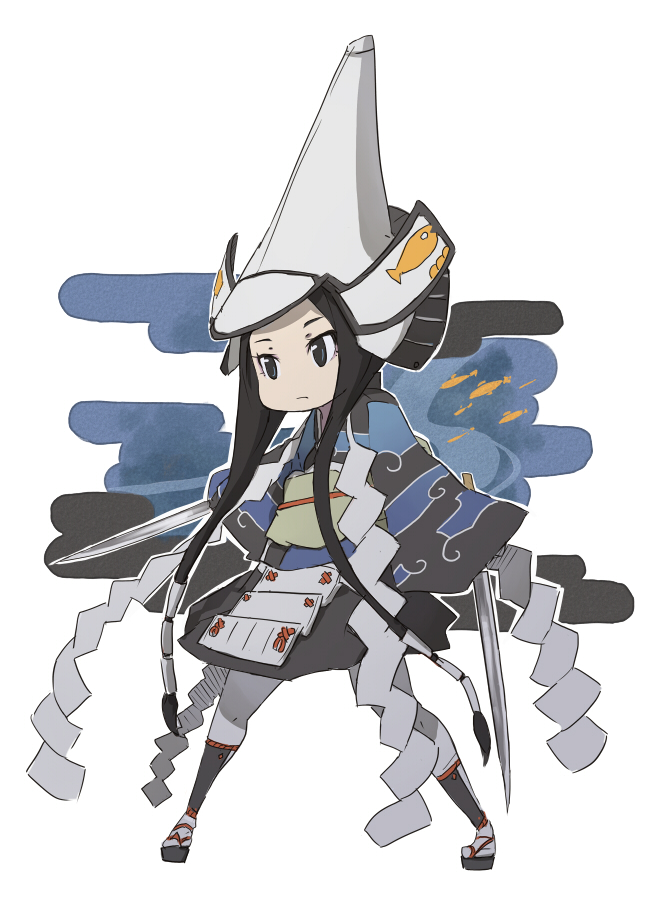 1girlarmorblack hairchibidual wieldingegasumifemale focushelmetholdingjapanese armorjapanese clotheskimonokusazurilong hairobisamuraisandalssashsolosuneateswordtabiweapon