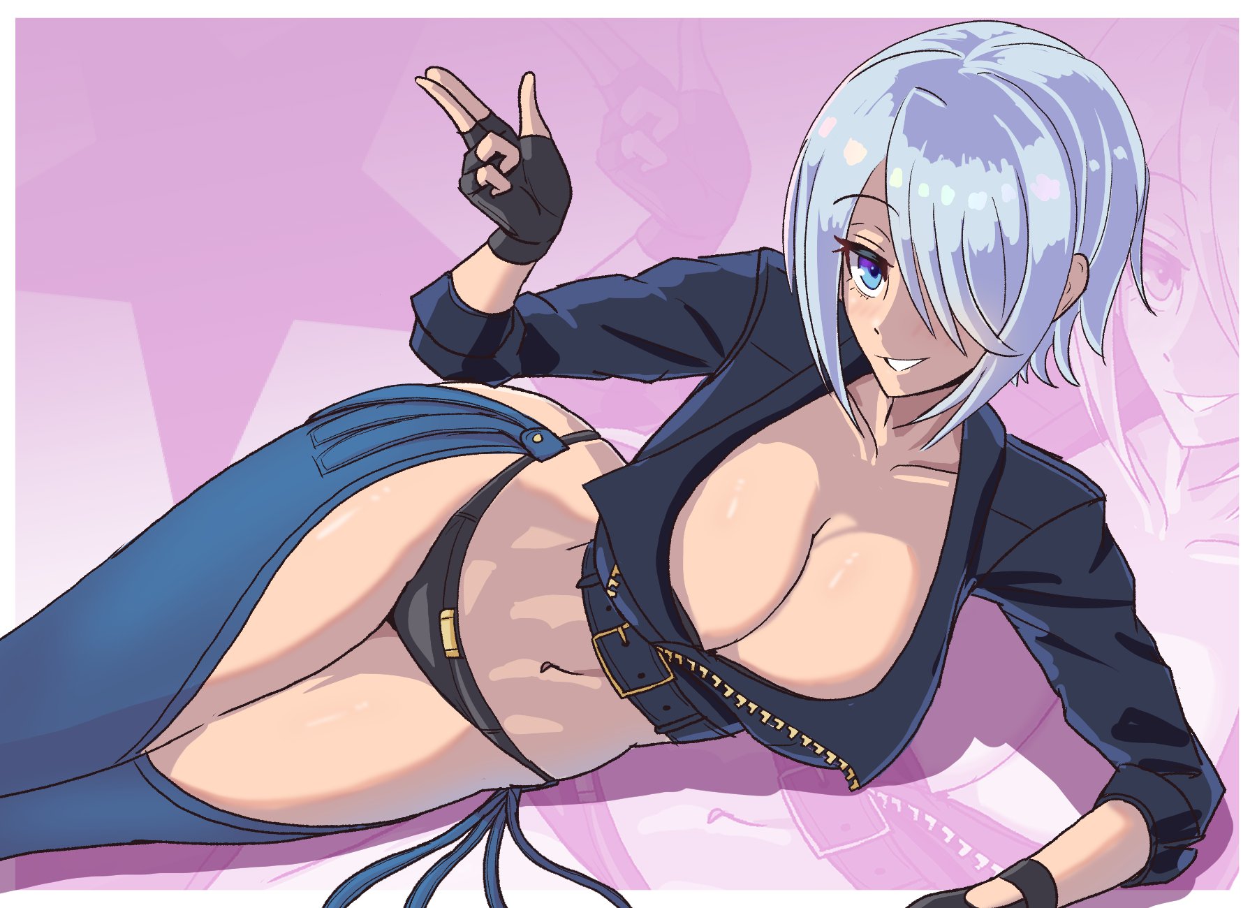 1girlbackless pantsblue eyesbootsbrabreastschapscleavagecowboy bootscrop topcropped jacketfingerless glovesgloveshair over one eyeindex fingers raisedjacketlarge breastsleatherleather jacketlooking at viewermidriffnavelpantiespantsshort hairsimple backgroundsmilesolostraplessstrapless bratonedtoned femaleunderwearwhite hair