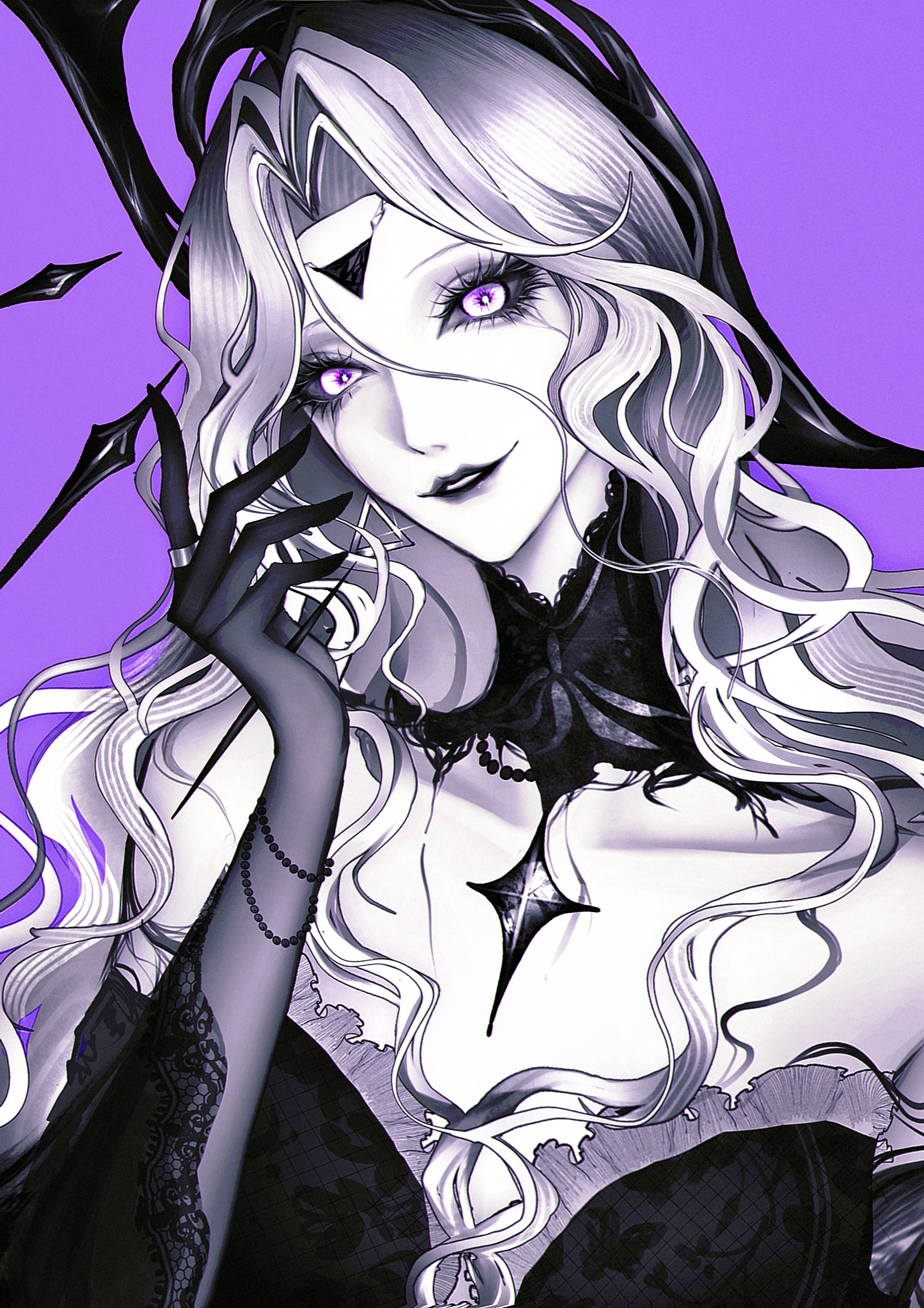 1girlbare shoulderscollarbonediffraction spikesearringselbow glovesfloatingfloating objectforehead jewelglovesglowingglowing eyesgrey hairhair between eyesirrheia (path to nowhere)jewelrylace collarlimited palettelong hairlooking at viewernecklacepale skinparted lipspurple backgroundpurple eyespurple themesimple backgroundsmilesolostar (symbol)star necklacetriangle earringsupper bodywavy hair