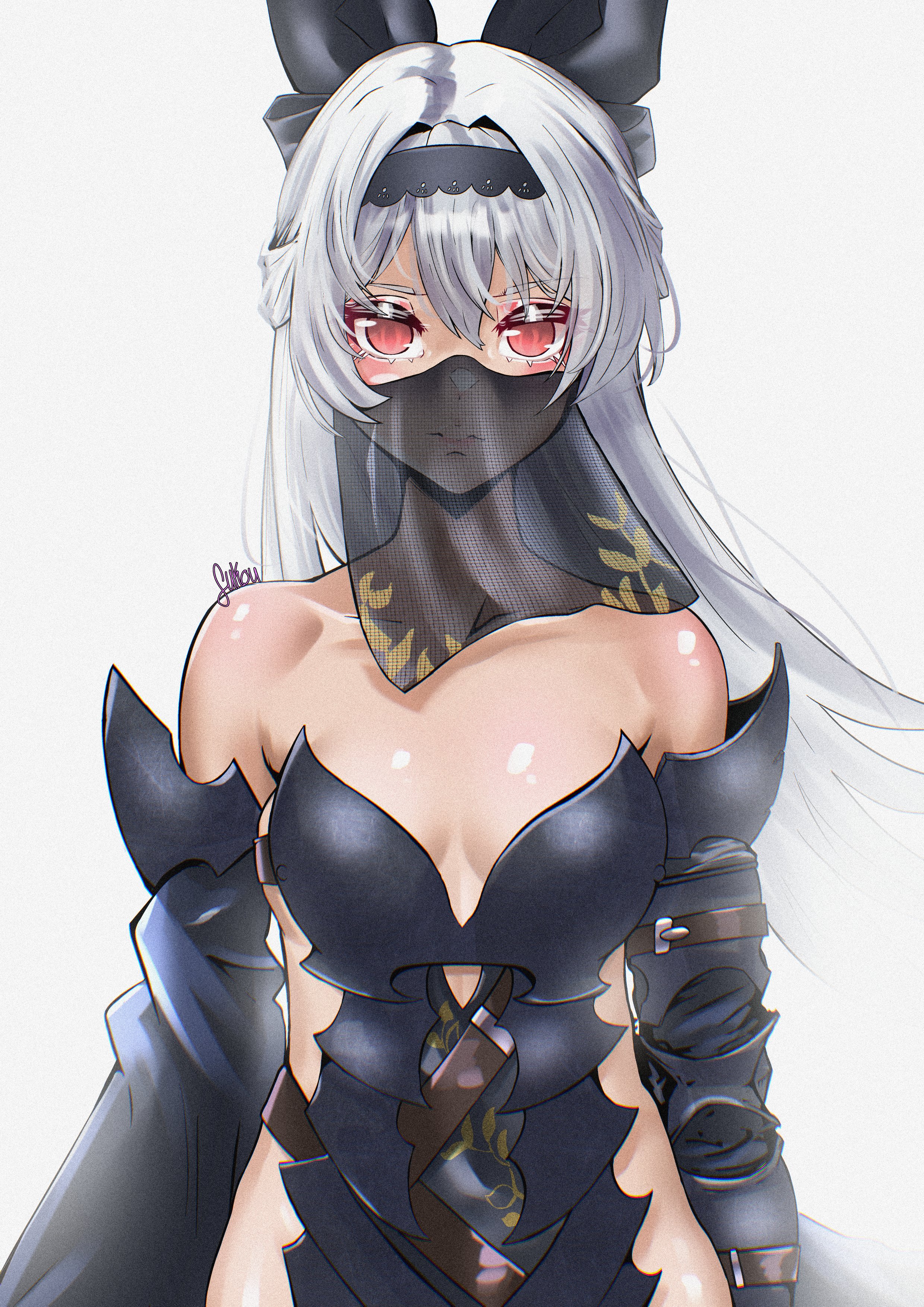 1girlarmorartist namebare shouldersblack bowblack headbandblack sleevesbowbreastscollarbonedetached sleevesgrey hairhair bowheadbandlong hairlooking at viewermouth veilofficial alternate costumeparted lipsred eyessee-through clothessee-through veilsmall breastssoloupper bodyveil