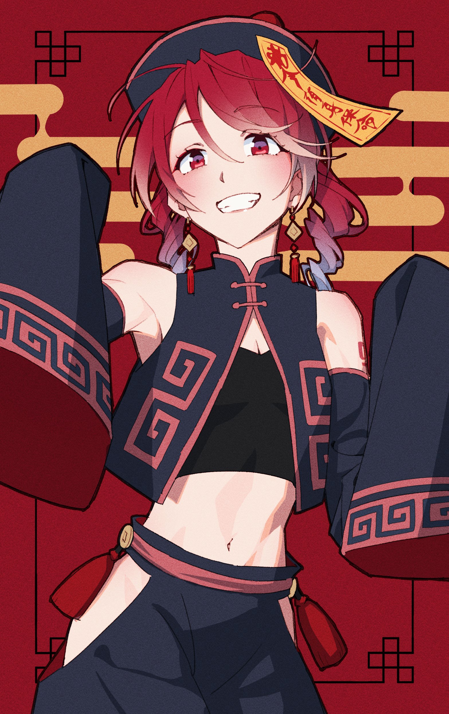 oni tama, toutetsu yuuma, touhou, commentary request, highres, 1girl, blue shirt, detached sleeves, earrings, fingernails, hoop earrings, horizontal pupils, horns, jewelry, looking at viewer, open mouth, pointy ears, red eyes, red horns, red nails, red sleeves, sharp fingernails, sharp teeth, shirt, short hair, simple background, sleeveless, sleeveless shirt, smile, solo, teeth, upper body, white background, white hair