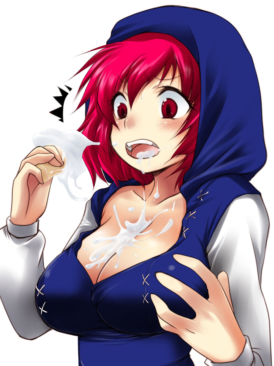1girlalternate costumeblushbreastscasualcleavagecontemporaryfemale focusfoodhoodhooded jacketice creamjacketlarge breastsred eyesred hairsexually suggestiveshort hairsolo