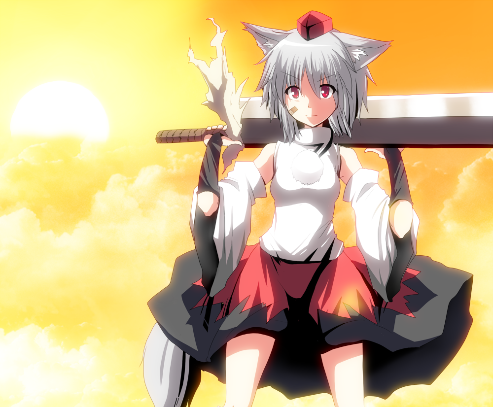 1girlanimal earsdetached sleevesfemale focushatred eyesshort hairsoloswordtailtokin hatweaponwolf earswolf tail
