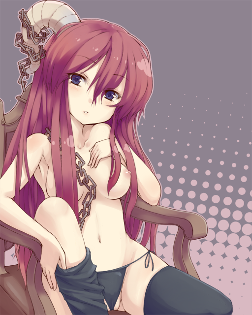 1girlblue eyeschaindemon girlfemale focushornslong hairpantiesred hairside-tie pantiessittingsolothighhighstopless femaleunderwear