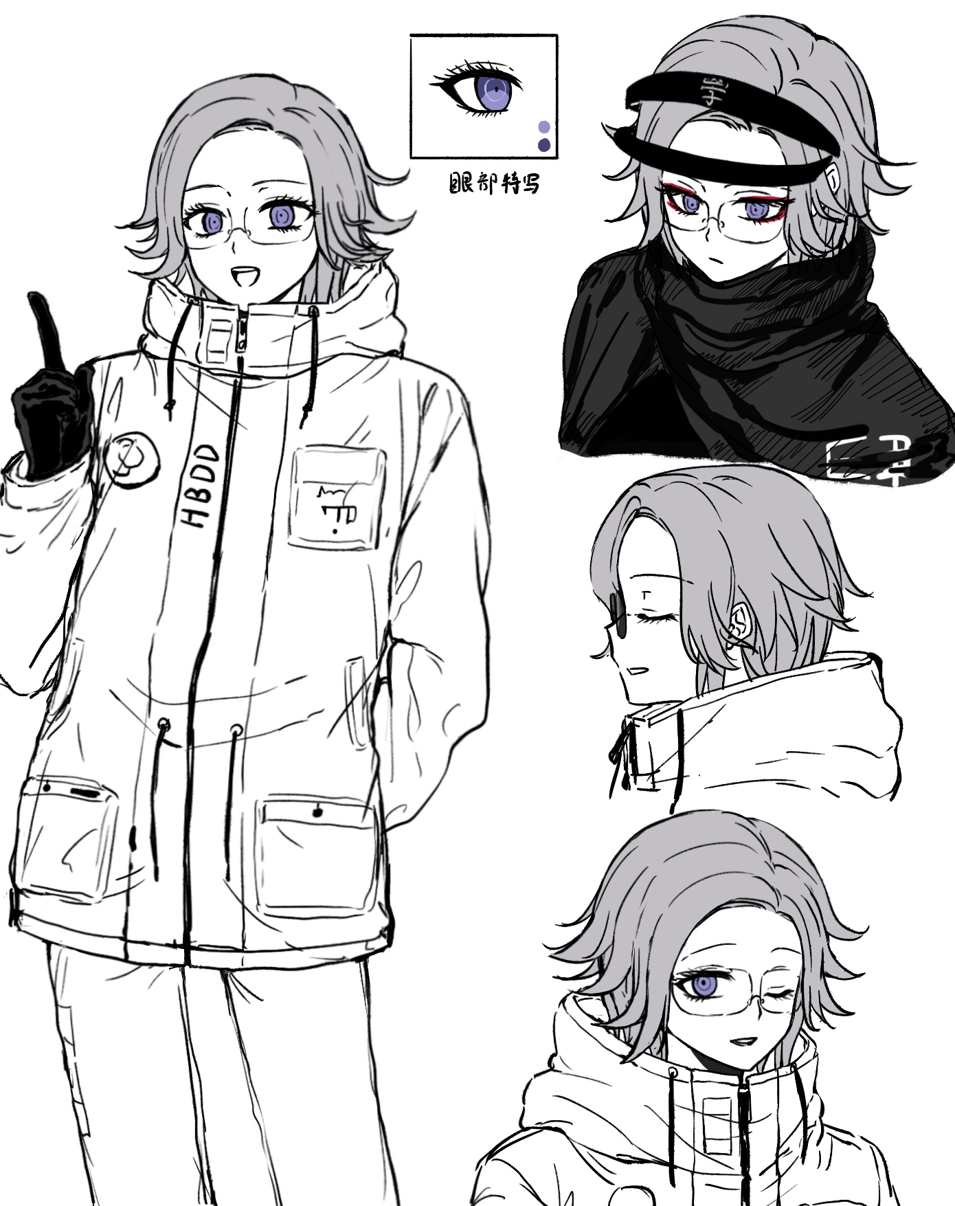 1boyblue eyeschinese textcloakclosed eyescolored eyelashesdrawstringeyelashesglassesglovesgreyscalehoodhood downhooded jacketjacketlast defense academy school uniformmale focusmonochromemultiple viewsone eye closedopen mouthpantspocketrectangular eyewearschool uniformsemi-rimless eyewearshort hairsimple backgroundsmilespot colorteethupper teeth onlywhite backgroundyu (qianshiguangjing95221)
