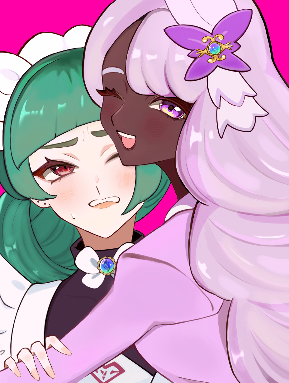 :d2girlsblushdark skindark-skinned femalehand uphuglong hairlooking at anotherlooking at viewermultiple girlsone eye closedopen mouthpink backgroundpurple eyesred eyessimple backgroundsmilesweatdropteethtilted headwearupper teeth only
