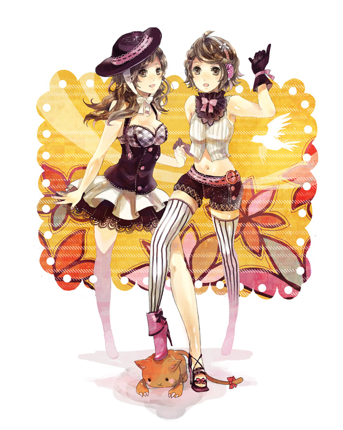2girlsbrown eyesbrown hairgloveshatholding handslegsmidriffmultiple girlsstriped clothesstriped thighhighsthighhighsvertical-striped clothesvertical-striped thighhighs