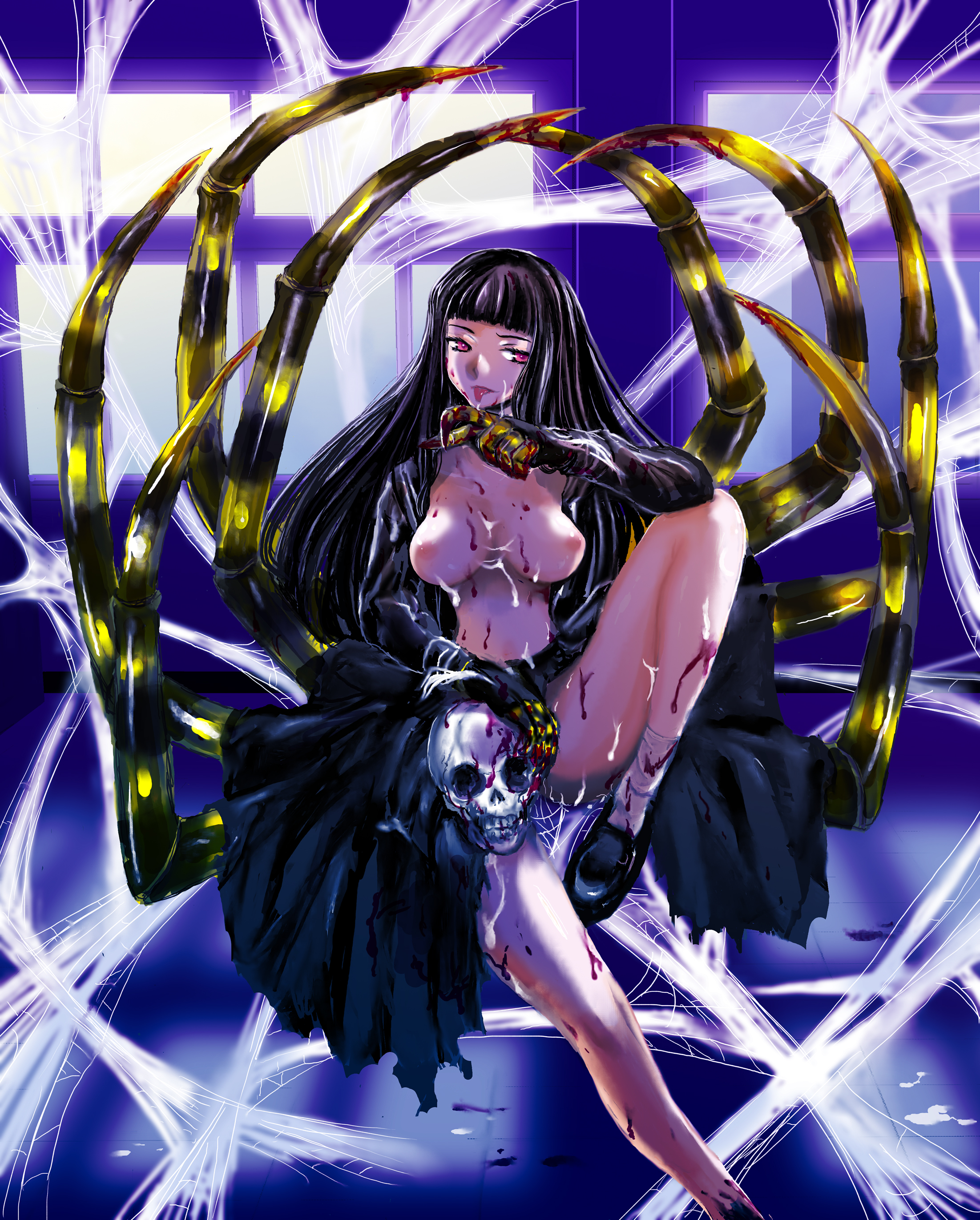 :p1girlarthropod girlblack hairbloodblunt bangsbreastsfemale focusinsect girllarge breastsleg uplegslickinglong hairmonster girlnipplesno braopen clothesopen shirtpink eyespleated skirtschool uniformserafukushirtshoessilksittingskirtskullsockssolospider girlspider webtonguetongue outtorn clothesvery long hairwindow
