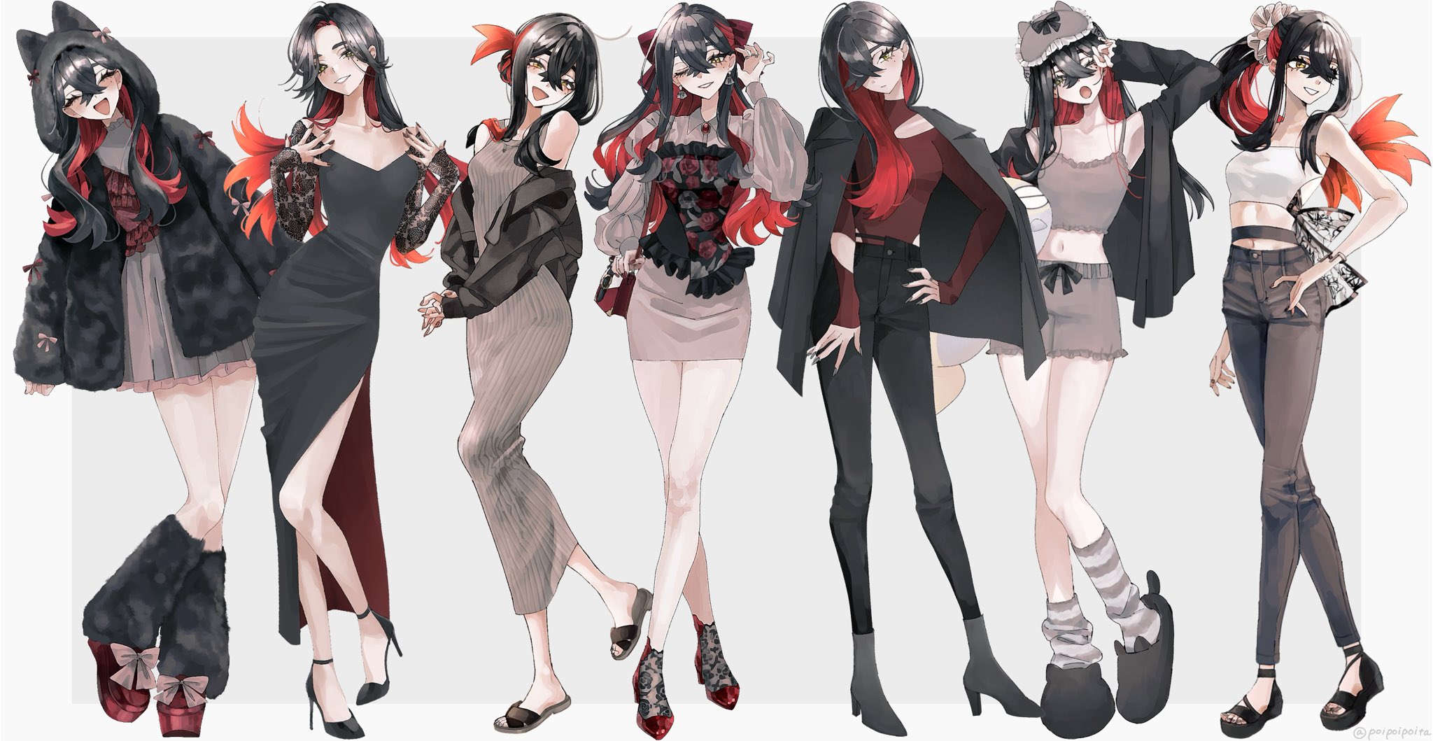 1girlalternate costumealternate hairstyleanimal earsartist namebagbare shouldersblack dressblack hairblack hoodblack jacketblack pantsblushbootsbowbreastscat earsclosed eyesclothing cutoutcolored inner haircolored scleracropped shirtcrossed bangscryingdolldressearringseyelashesfake animal earsfloral printfur jacketgrey dressgrinhair between eyeshair bowhair bunhair ornamenthair over one eyehair scrunchiehandbaghigh heel bootshigh heelsholdingholding bagholding dollhugjacketjewelrylace trimlong hairlong sleeveslooking at viewermidriffmolemole under eyemulticolored hairnavelone eye closedopen clothesopen jacketopen mouthpantsparted lipsplatform sandalsponytailred bowred hairred shirtsandalsscrunchieshirtsimple backgroundsleevelesssleeveless dresssmilesnoutsocksstandingstuffed toysweatdroptearsteethtoestonguetwitter usernametwo-tone hairwavy hairwhite shirtyellow eyes