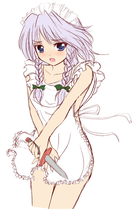1girlapronblue eyesblushbraidfemale focushairbandknifenaked apronshort hairsolothrowing knifetwin braidsweapon