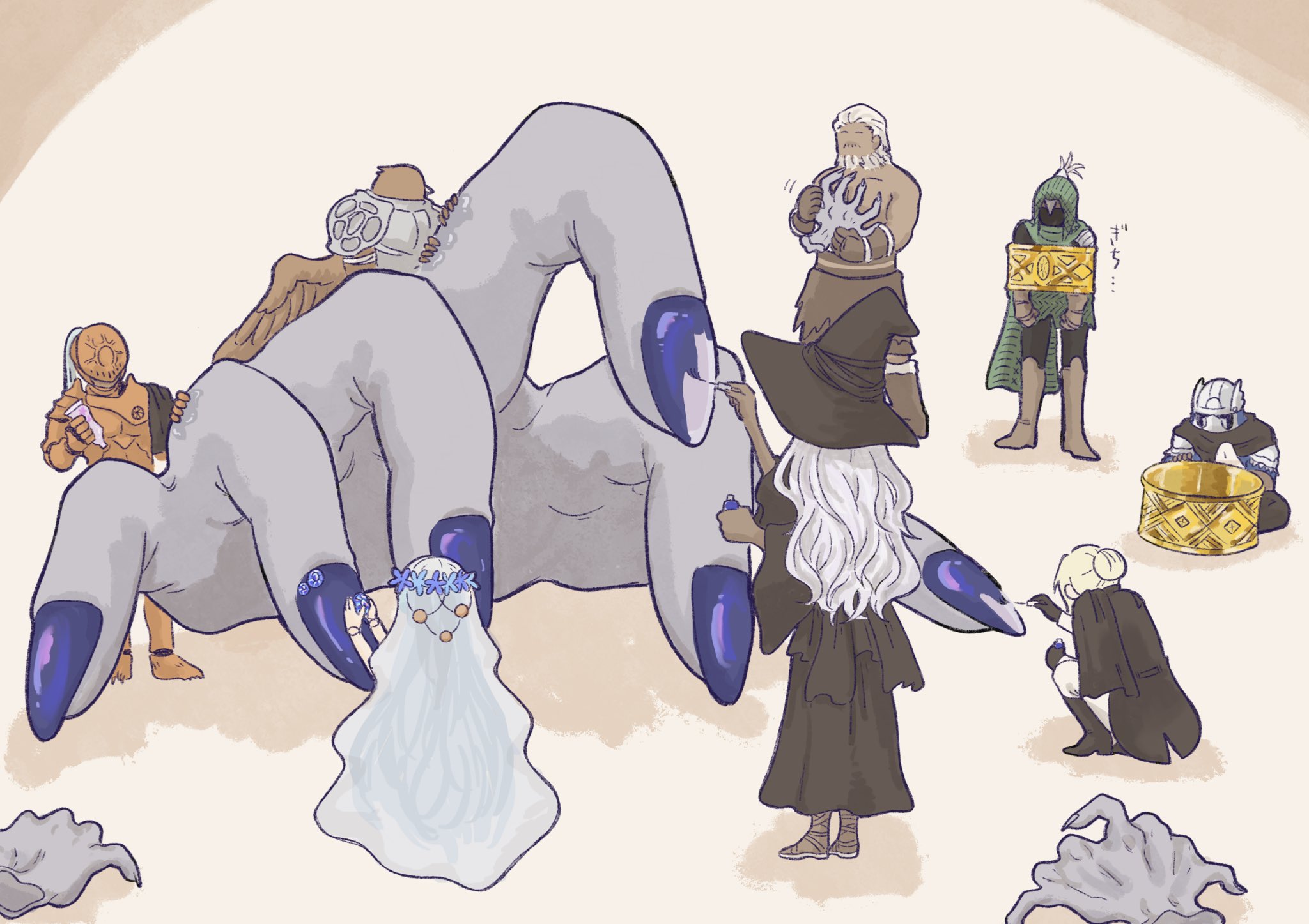 manmaderain, ichika (blue archive), kasumi (blue archive), blue archive, absurdres, commentary, highres, 2girls, anger vein, armband, barefoot, blush, collared shirt, demon tail, fang, gloves, hair ornament, hairclip, halo, hand on another's thigh, limited palette, long hair, low wings, multiple girls, neckerchief, open mouth, pleated skirt, red eyes, school uniform, serafuku, shirt, skirt, sweat, tail, toes, wings, yuri