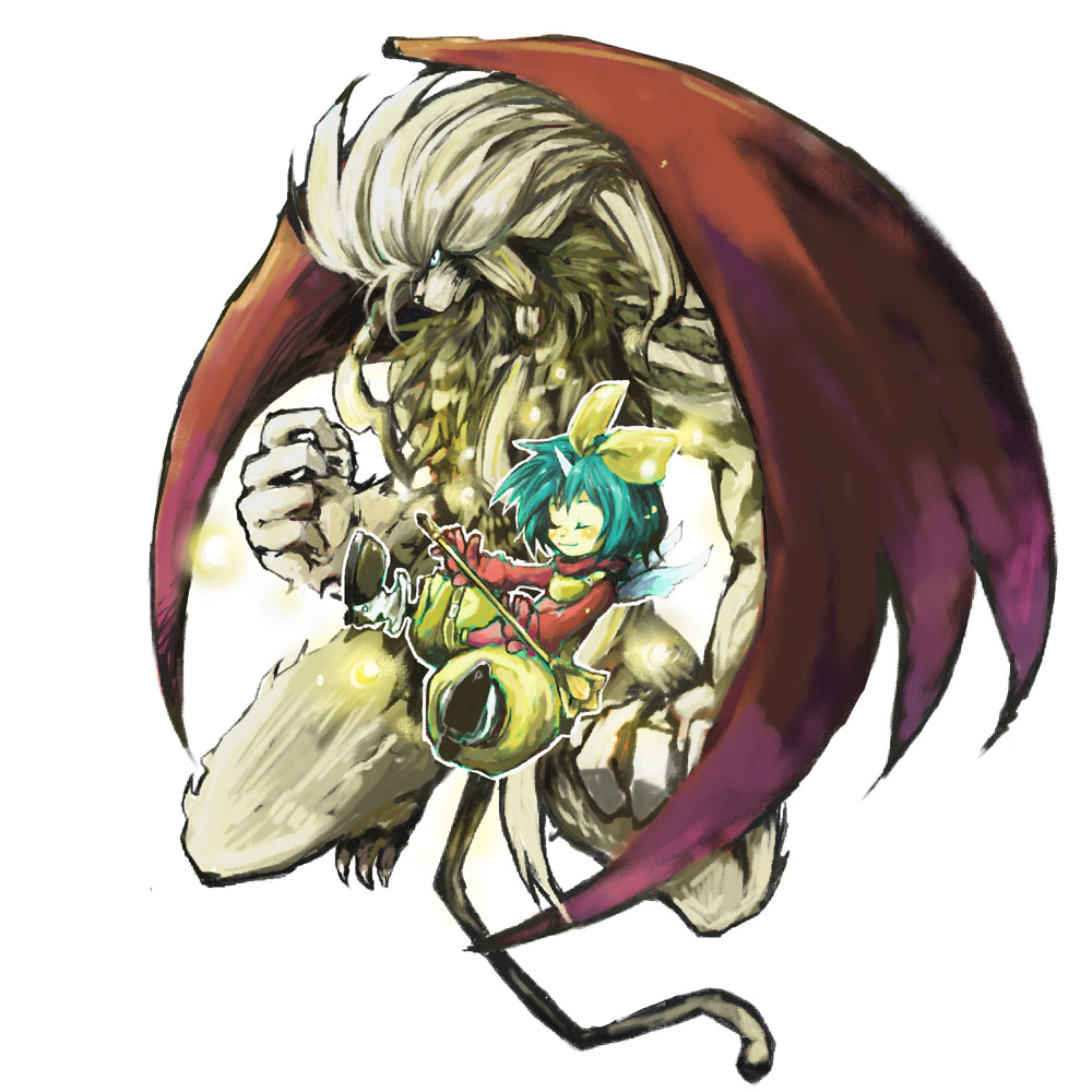 00s1girlblue hairblushbootschildclosed eyeshornsmonsterribbonshort hairsingle hornsmilewandwings