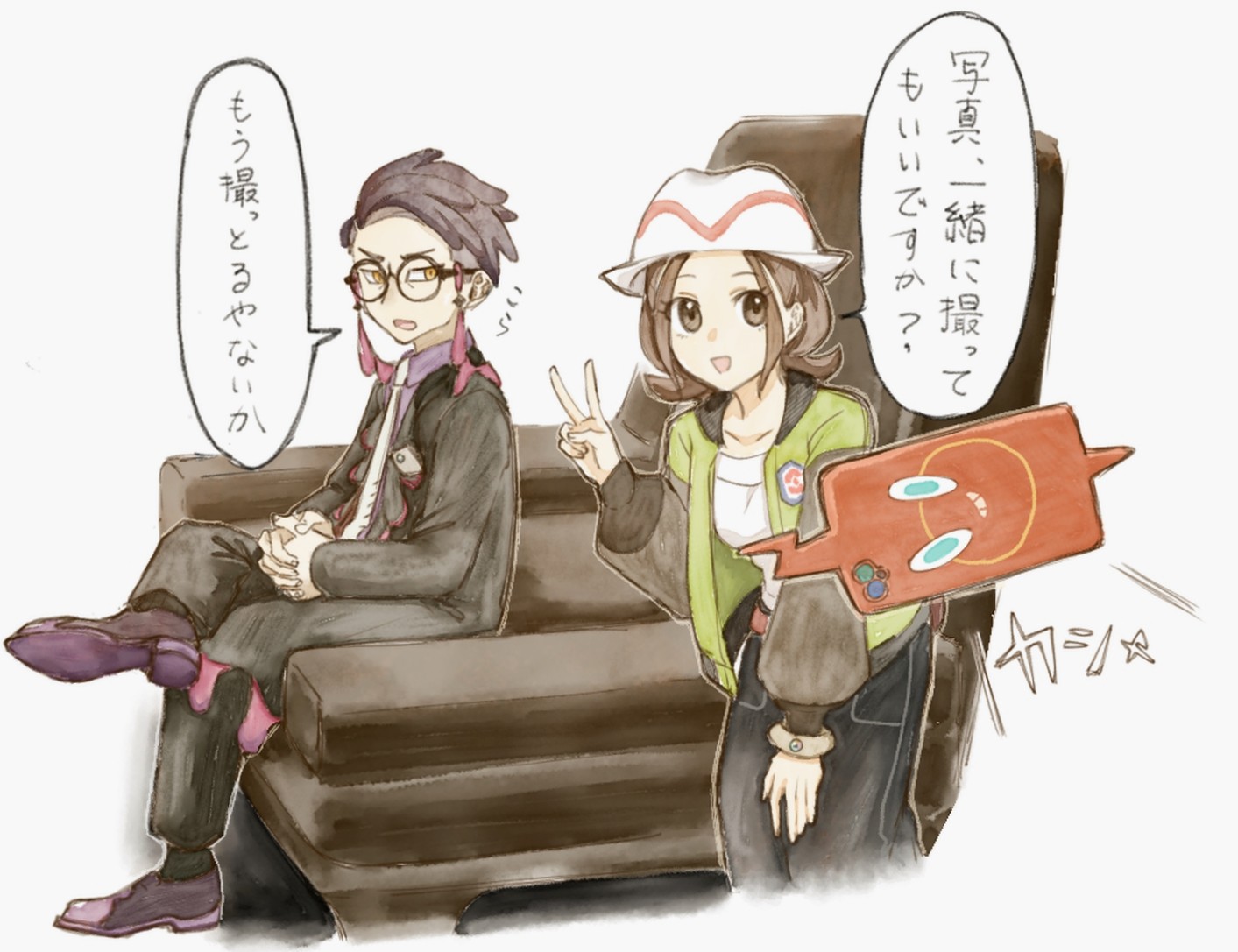 :d1boy1girlblack jacketbrown eyesbrown hairchaircollared shirtgen 4 pokemongreen jackethand uphatinterlocked fingersjacketlooking to the sidenecktieopen clothesopen jacketopen mouthown hands togetherpantspurple shirtshirtshoessittingsmilespeech bubblevwhite hatwhite necktiewhite shirtyellow eyes