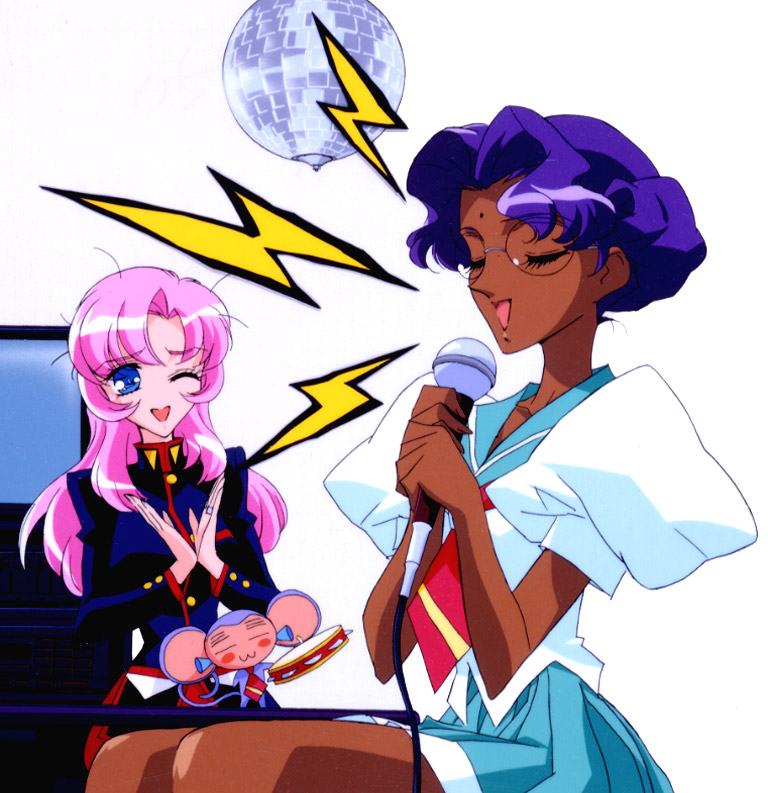 1990s (style)2girlsblue eyesblue sailor collarclappingclosed eyesdark skindark-skinned femaledisco ballglassesinstrumentjewelrykaraokelong hairmicrophonemultiple girlsmusicpink hairpurple hairretro artstyleringsailor collarschool uniformserafukushort hairsingingtambourinewince