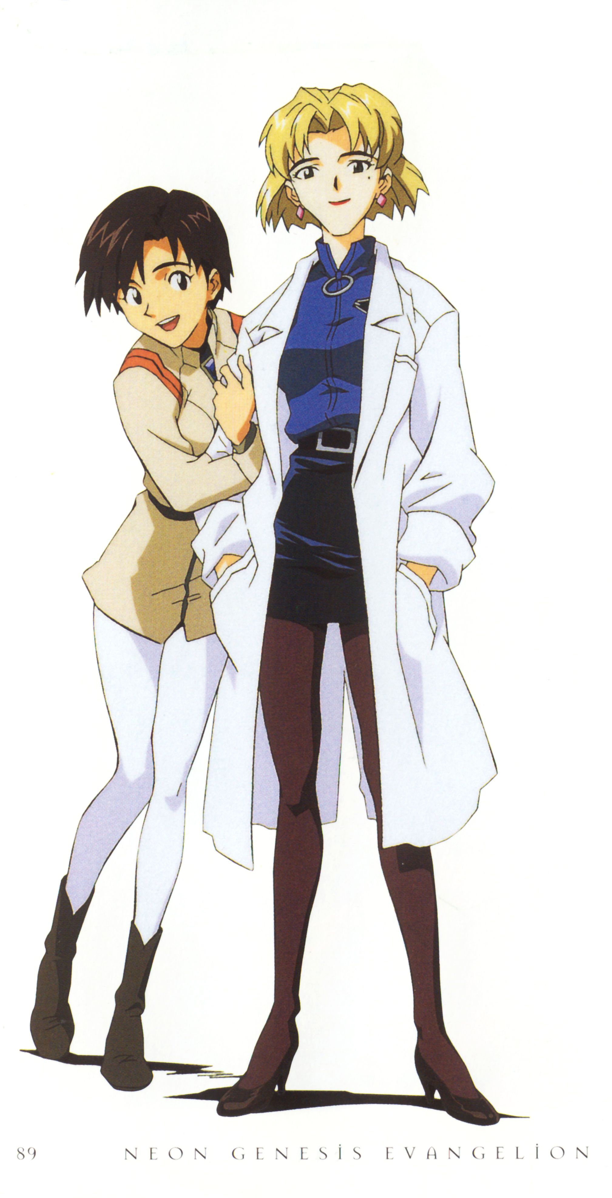 2girlsandrogynousblonde hairbrown hairearringsjewelrylab coatmolemole under eyemultiple girlspantyhosepencil skirtshort hairskirt