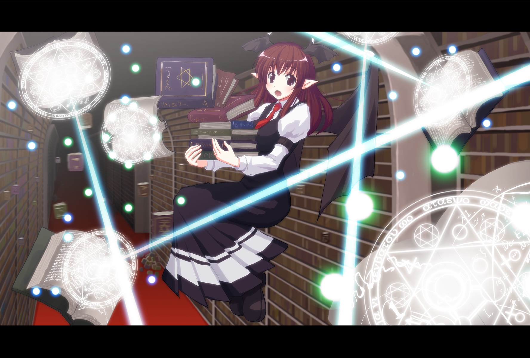 1girlbookbookshelfbrown eyesbrown hairdanmakudemon wingsfemale focushead wingsindoorslaserletterboxedlibrarymagic circlepointy earssittingsolovoilewings