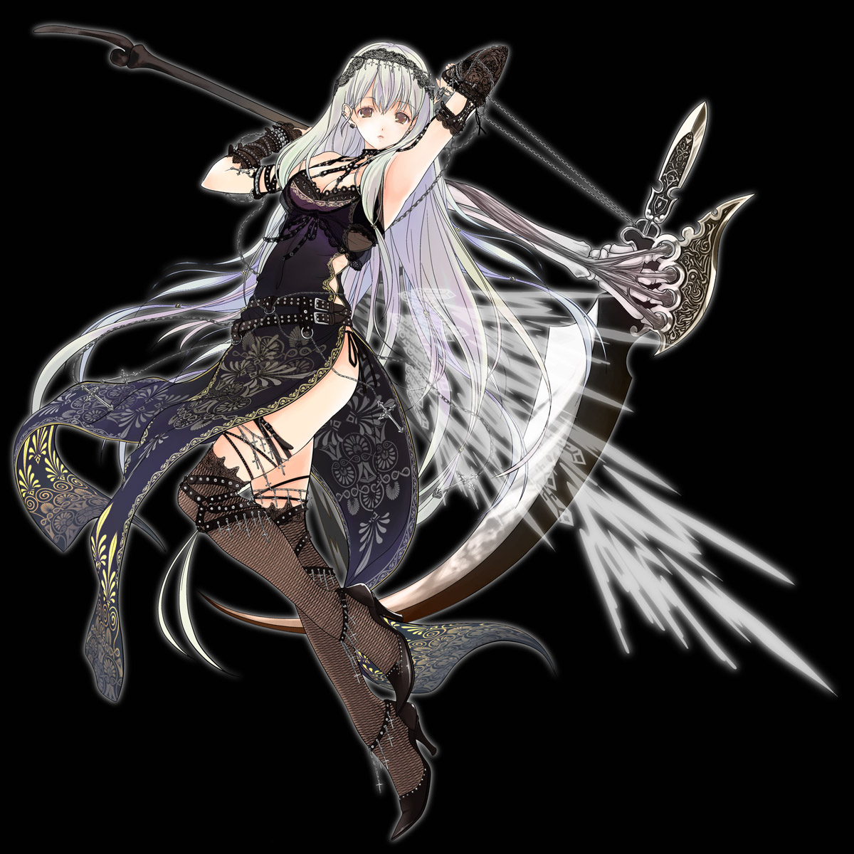1girlarmpitsblack dressbreastsbrown eyeschaincleavagecrossdetached sleevesdressearringselbow glovesfemale focusfull bodygloveshigh heelsjewelrylarge breastslong hairscytheshoessimple backgroundsmilesolothighhighsvery long hairwhite hair