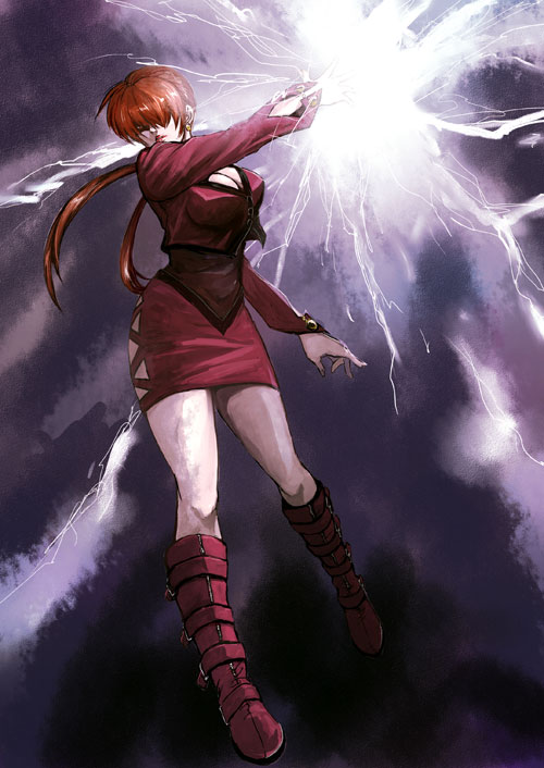 1girlbootscleavage cutoutclothing cutoutfemale focushair over eyesknee bootslightningminiskirtred hairskirtsolotwintails