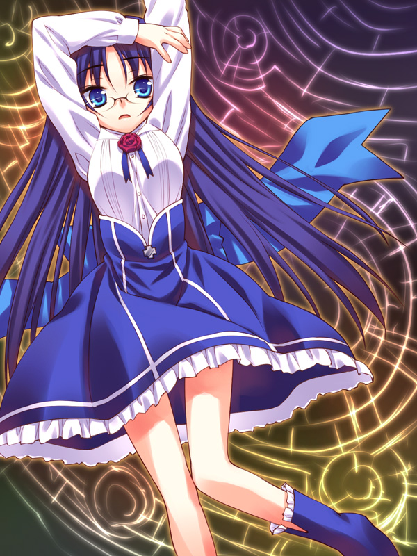 00s1girlblue eyesblue hairdressfemale focusglasseslong hairmagic circlematching hair/eyesround eyewearskirtsolo