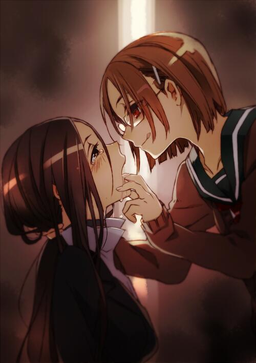 2girlsblack eyesblack jacketblack sailor collarbrown cardiganbrown haircardigandroolingfinger in another's mouthglasseshair ornamenthairclipjacketmultiple girlsopen mouthred eyessailor collarsalivaschool uniformserafukusmiletearstonguetongue outyuri