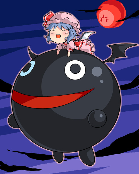 1boy1girlbat wingsblue hairblushchibiclosed eyescloudcreaturecrossoverdressfemale focusfloatinghappyhatlyinglying on anothermob capmoonnightnight skyon stomachoutdoorsoutlinepink dresspink hatred moonsitting on animalskysmilesolowingsyukkuri shiteitte ne